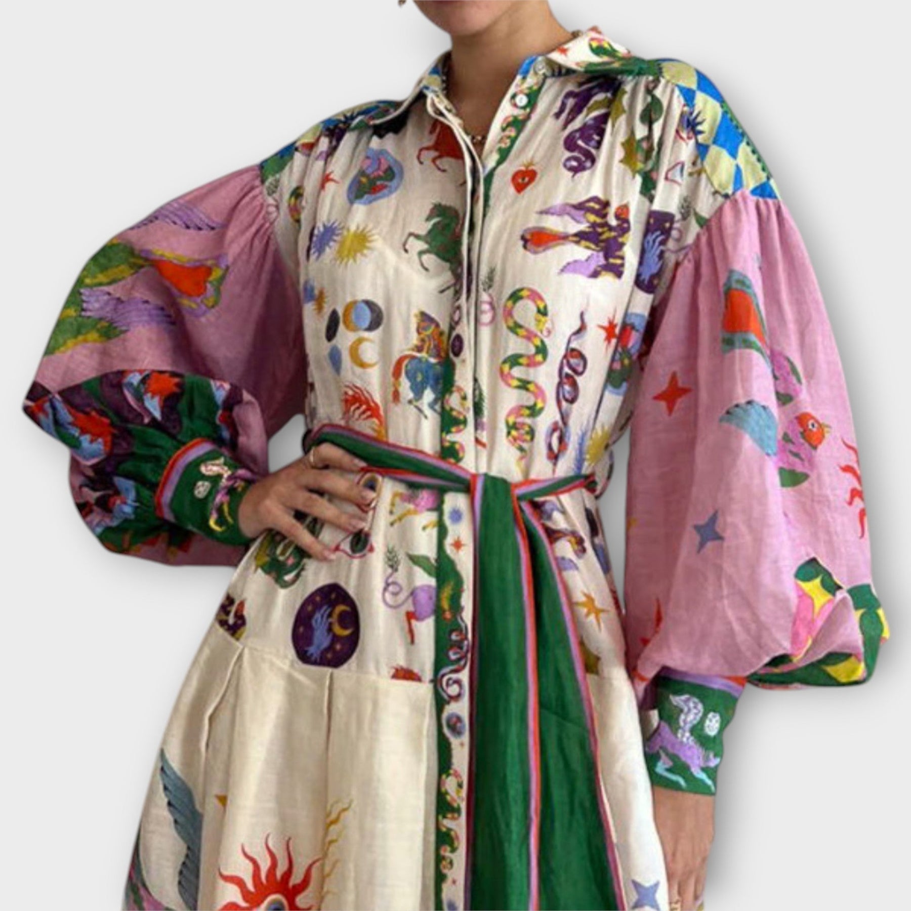• Φαρδιά φουσκωτά μανίκια: Προσδίδουν όγκο και χαρακτήρα στο σύνολο.