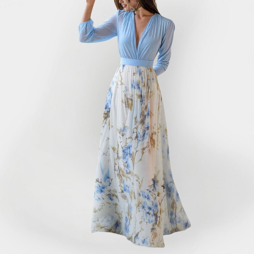 Μακρύ Λουλουδάτο Φόρεμα με V Ντεκολτέ και Ρομαντική Φινέτσα