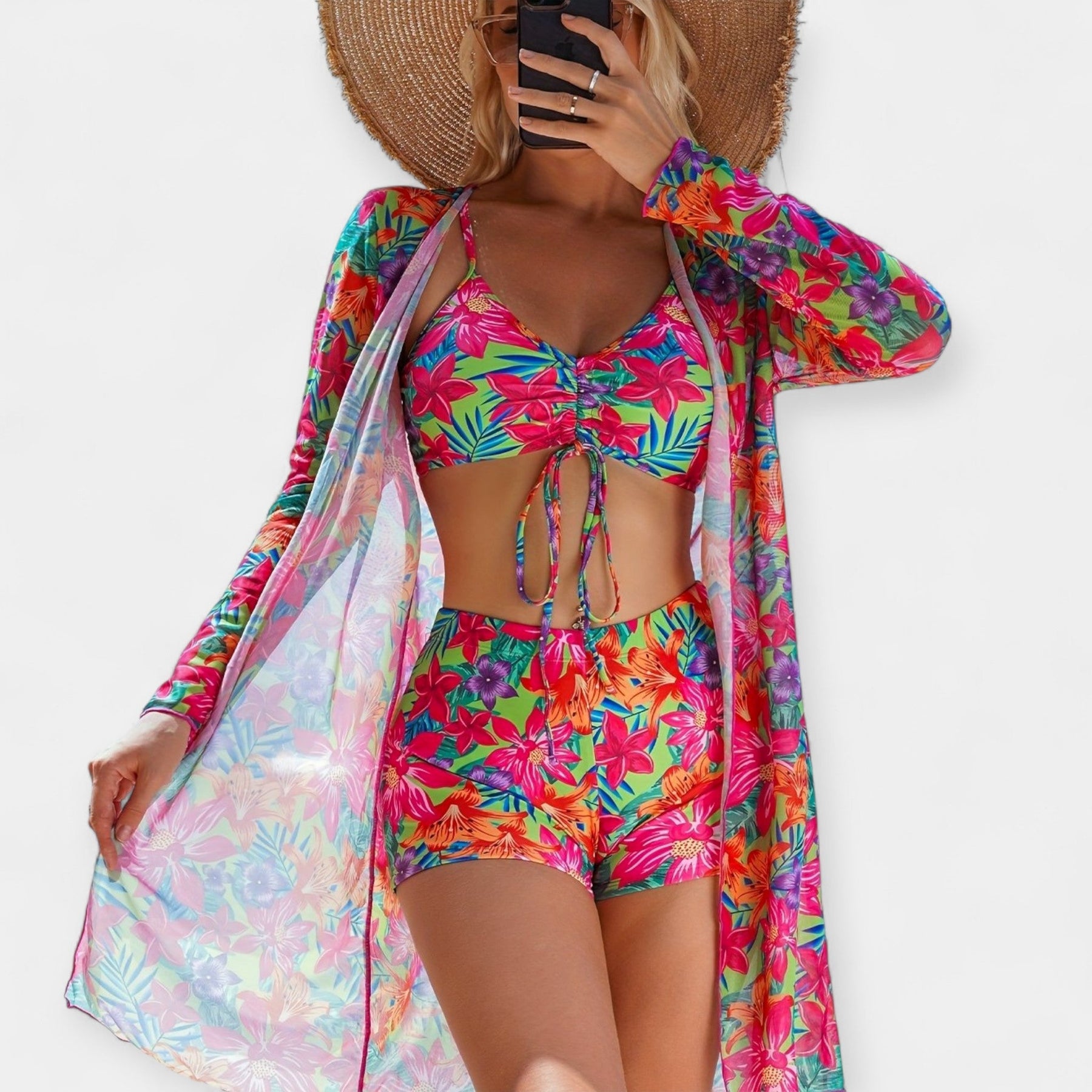 Αυτό το μοντέρνο σετ συνδυάζει άνεση, στυλ και κομψότητα για ολοκληρωμένες καλοκαιρινές εμφανίσεις. Το χαϊγουέιστ μπικίνι αγκαλιάζει τη σιλουέτα, το τοπ με φιόγκο αναδεικνύει το μπούστο, ενώ το ελαφρύ ρούχο παραλίας προσθέτει φινέτσα και ευελιξία.
